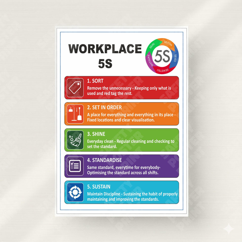 This Workplace 5S poster provides a clear visual explanation of all five principles of 5S – Sort, Set in Order, Shine, Standardize, and Sustain. It helps employees understand workplace organization, improve efficiency, reduce waste, and maintain discipline. Suitable for factories, warehouses, offices, and production areas supporting Lean and Kaizen systems.